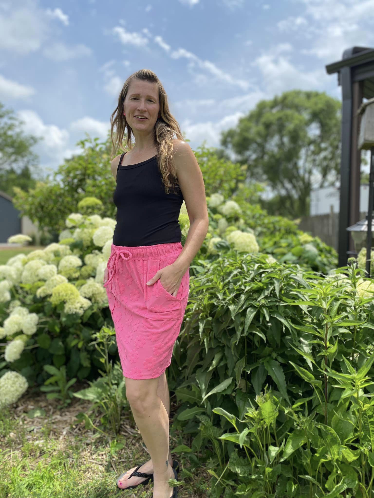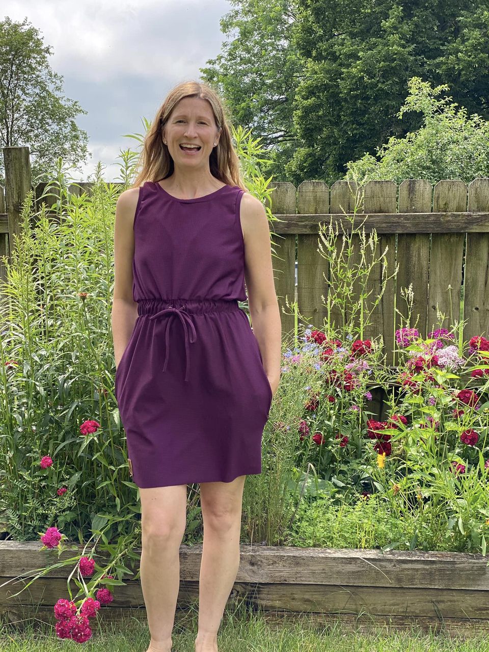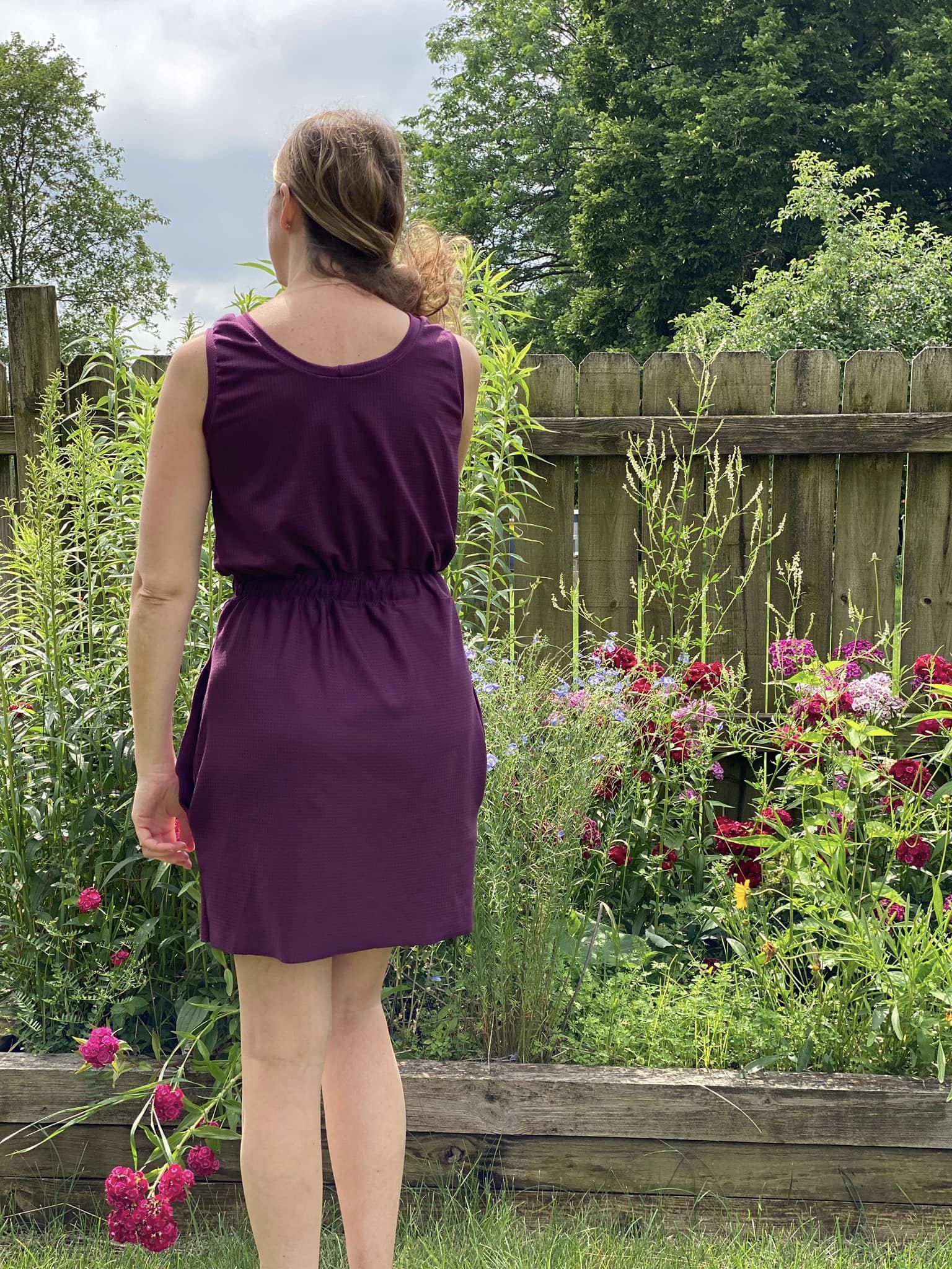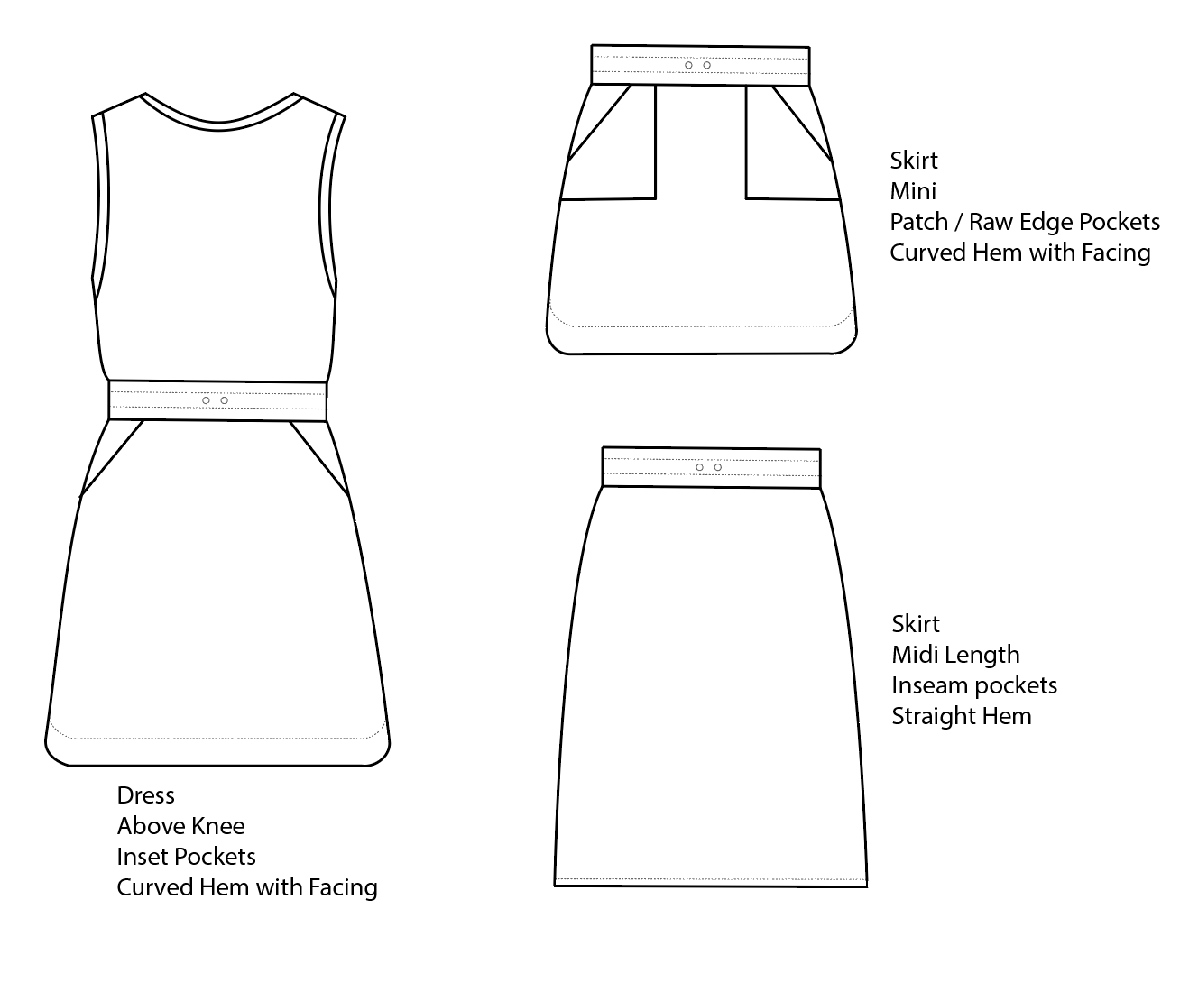 The Drew skirt and dress is a loose fitting, casual skirt or dress with an elastic waistband.The dress option offers a sleeveless style finished with bands and a relaxed fit bodice. Choose between a basic crew neck line or a scoop back. The skirt (added on to the dress or stand alone) offers three lengths (mini, above the knee, and midi), two hem finishes (straight hem or wide facing with curved hem), four pocket options (inseam, inset, patch, and raw edge patch), and a drawstring.