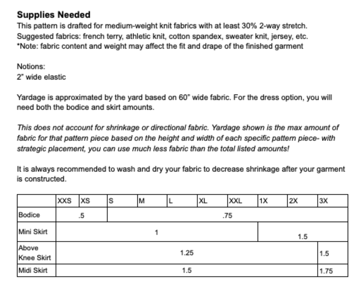 This pattern is drafted for medium-weight knit fabrics with at least 30% 2-way stretch. Suggested fabrics: french terry, athletic knit, cotton spandex, sweater knit, jersey, etc.