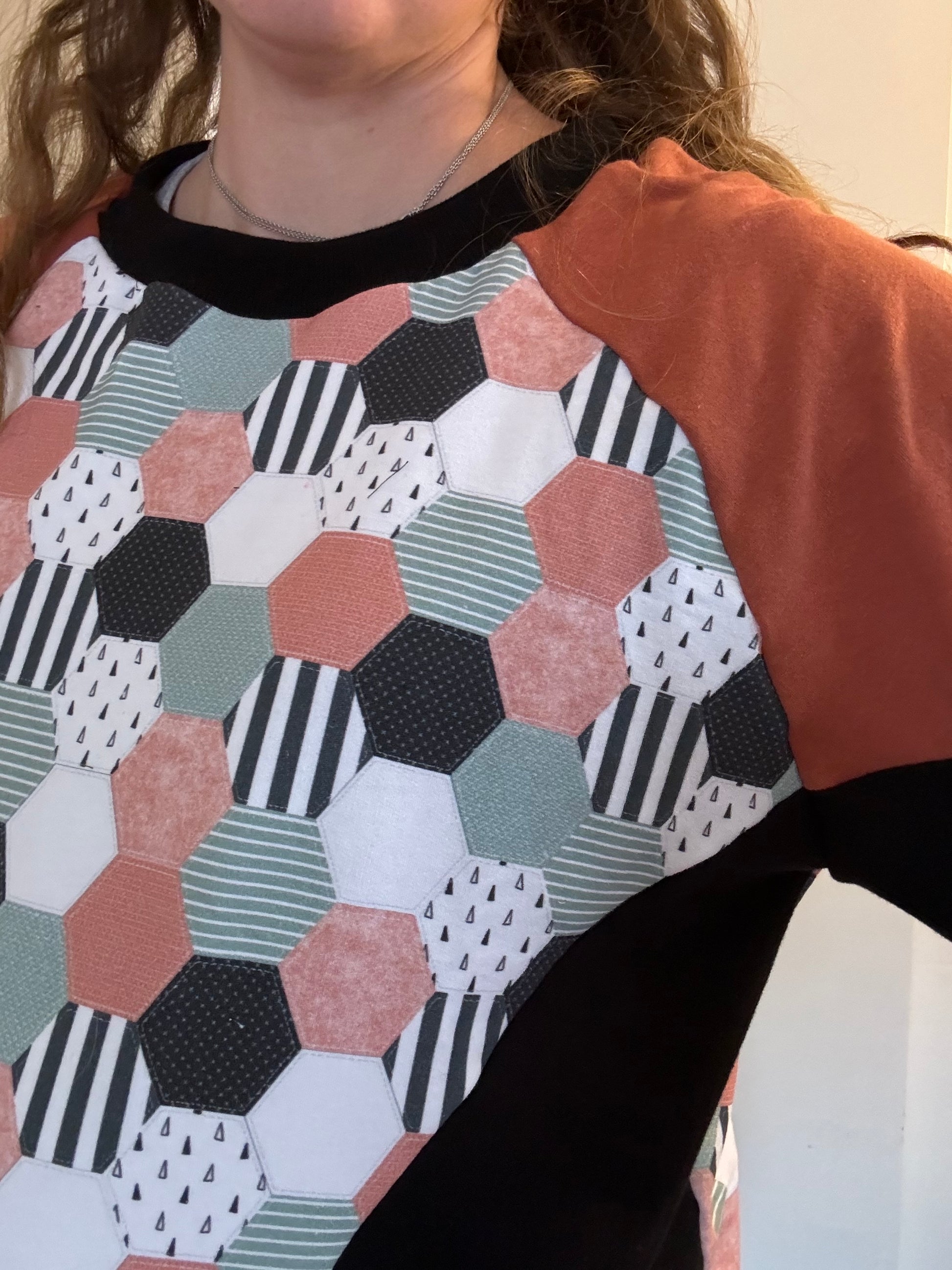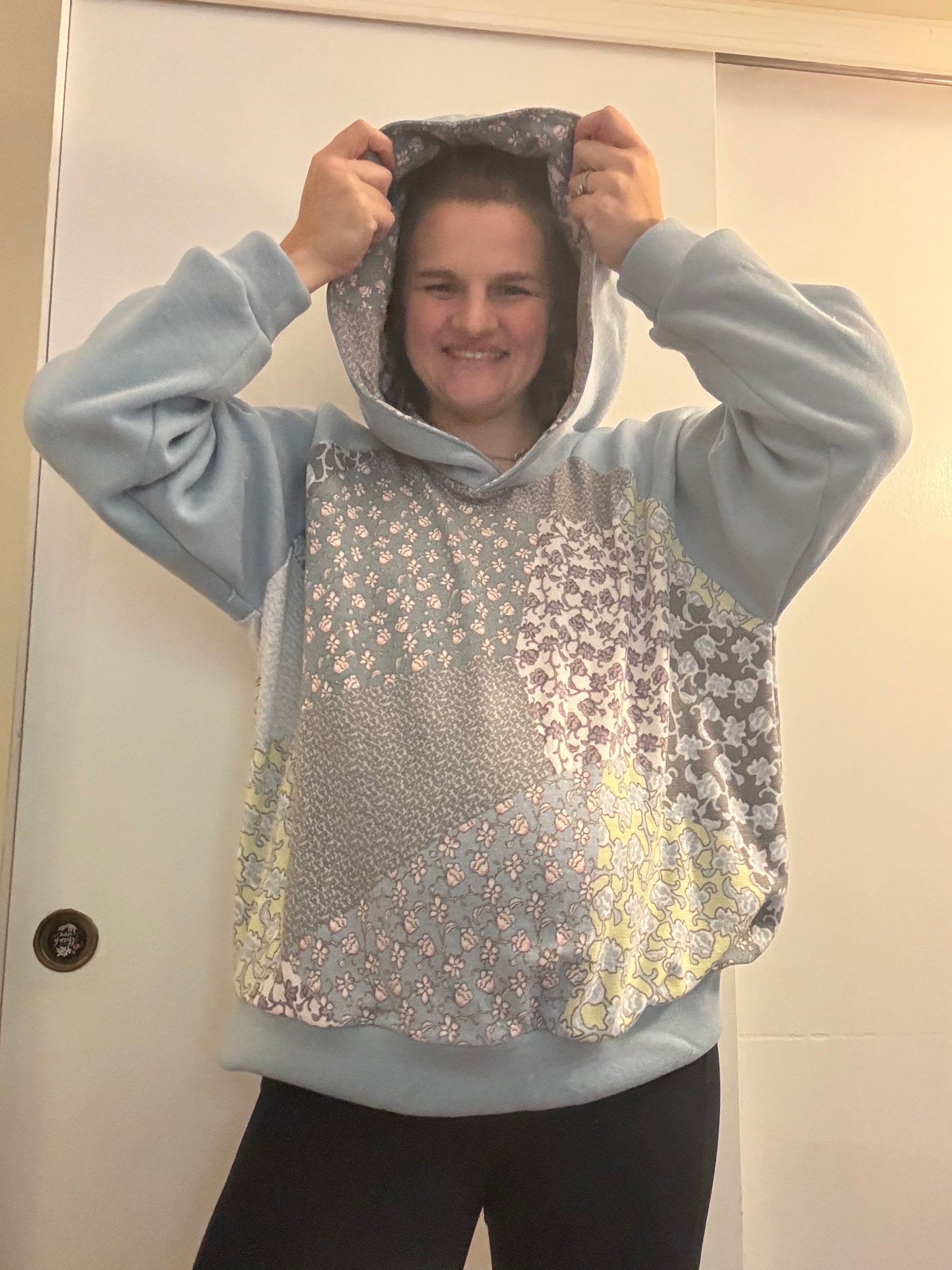 The Addy Pullover is a raglan style pullover. It is designed with a very oversized fit. It features a basic or colorblocked option, oversized hood, cowl neck, and neckband. The color block version has a colorblocked front and sleeves with a unique curve and pockets.