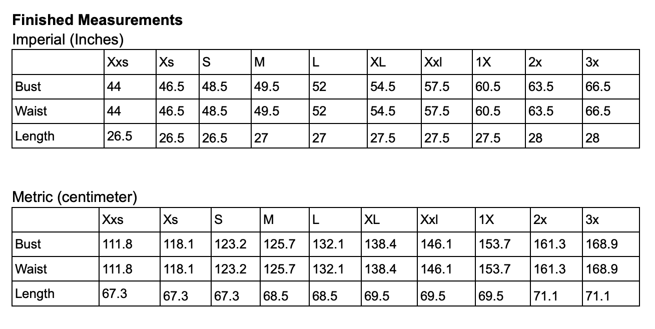 This pattern includes 10 sizes (US XXS- 3X)