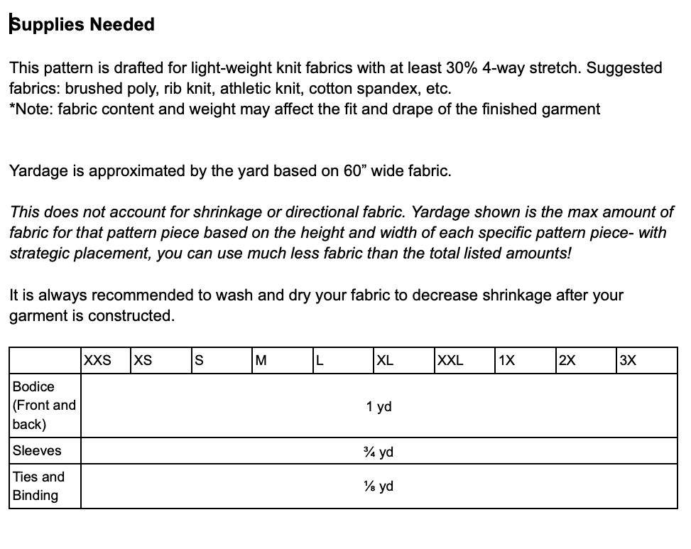 This pattern is drafted for light-weight knit fabrics with at least 30% 2-way stretch. Suggested fabrics: brushed poly, rib knit, athletic knit, cotton spandex, stretch lace, slub, etc.