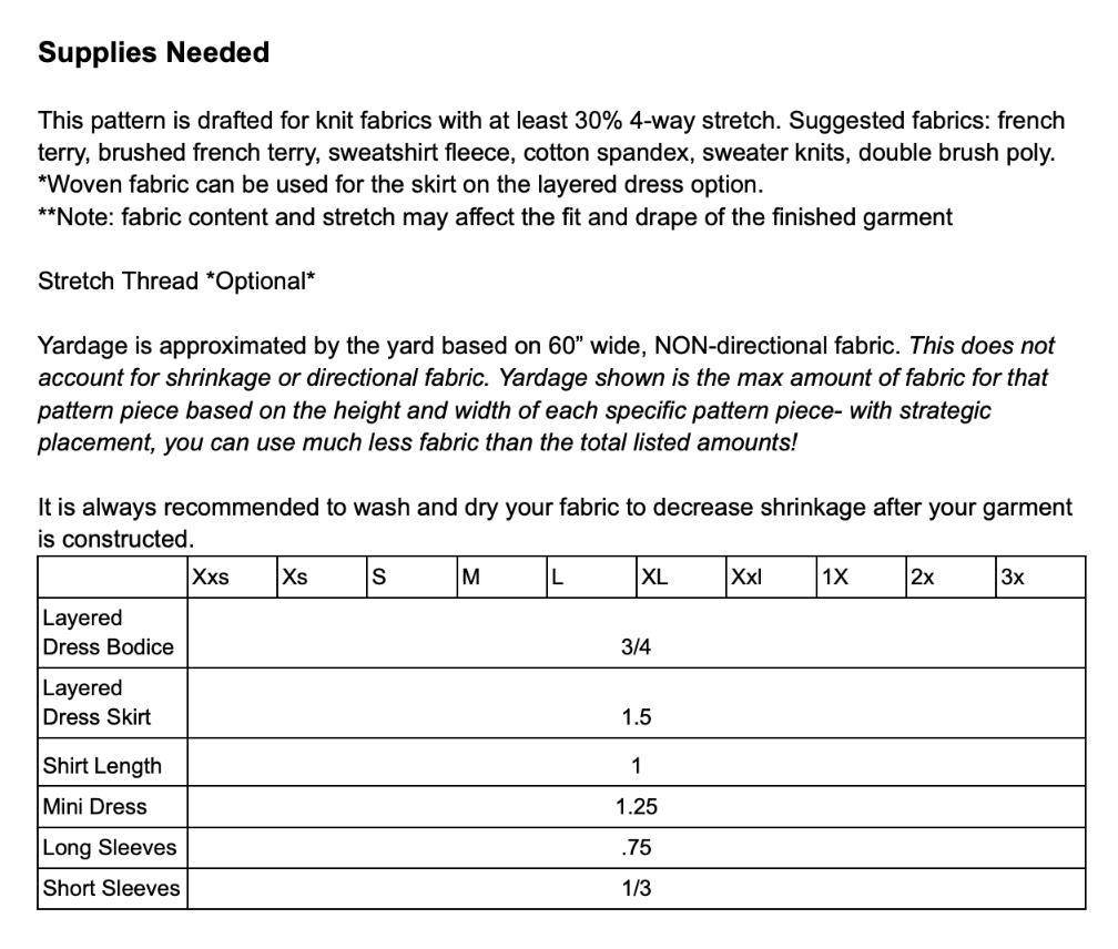 This pattern is drafted for knit fabrics with at least 30% 4-way stretch. Suggested fabrics: french terry, brushed french terry, sweatshirt fleece, cotton spandex, sweater knits, double brush poly.