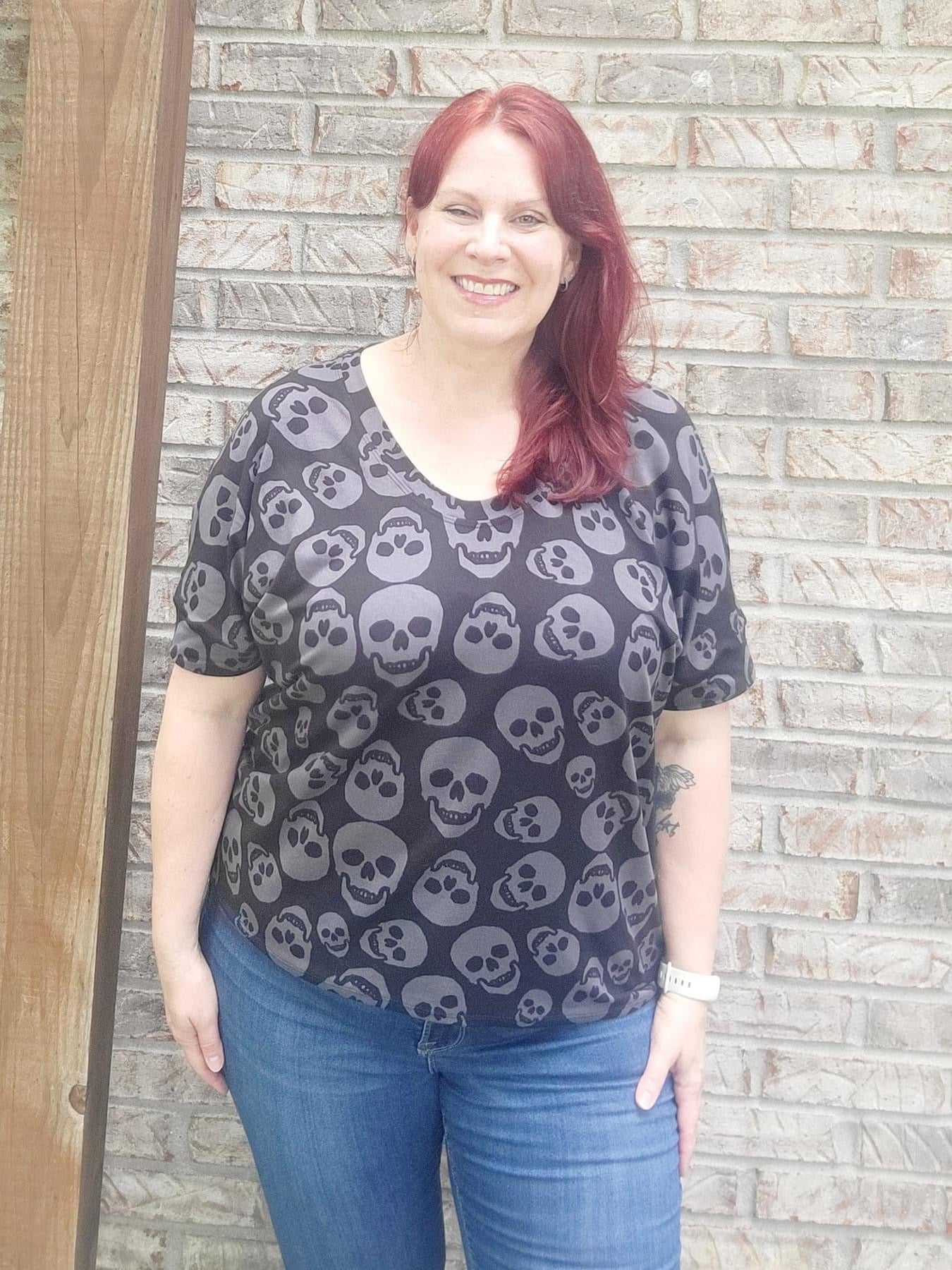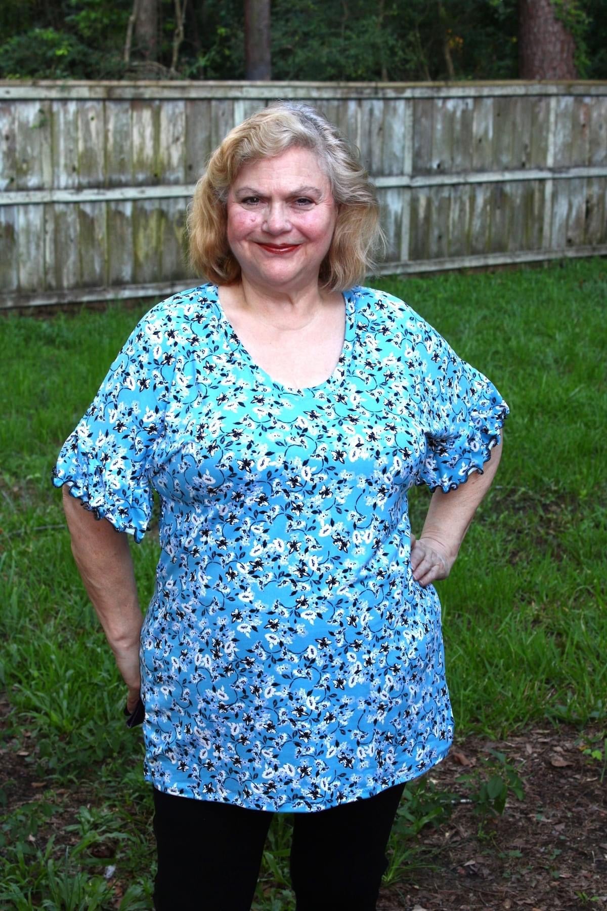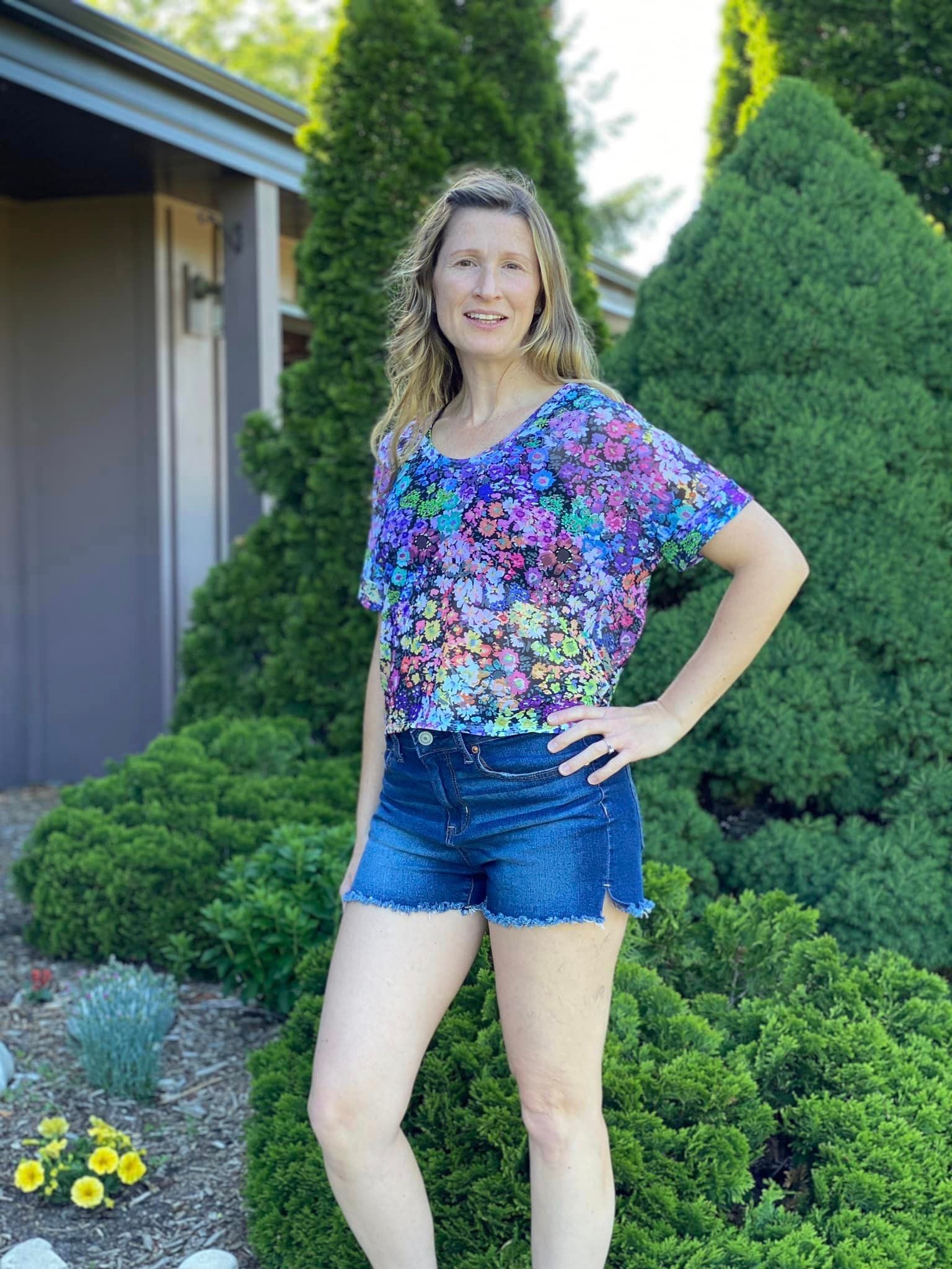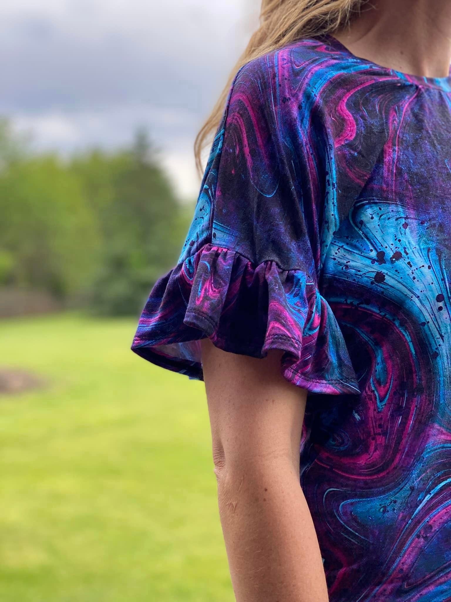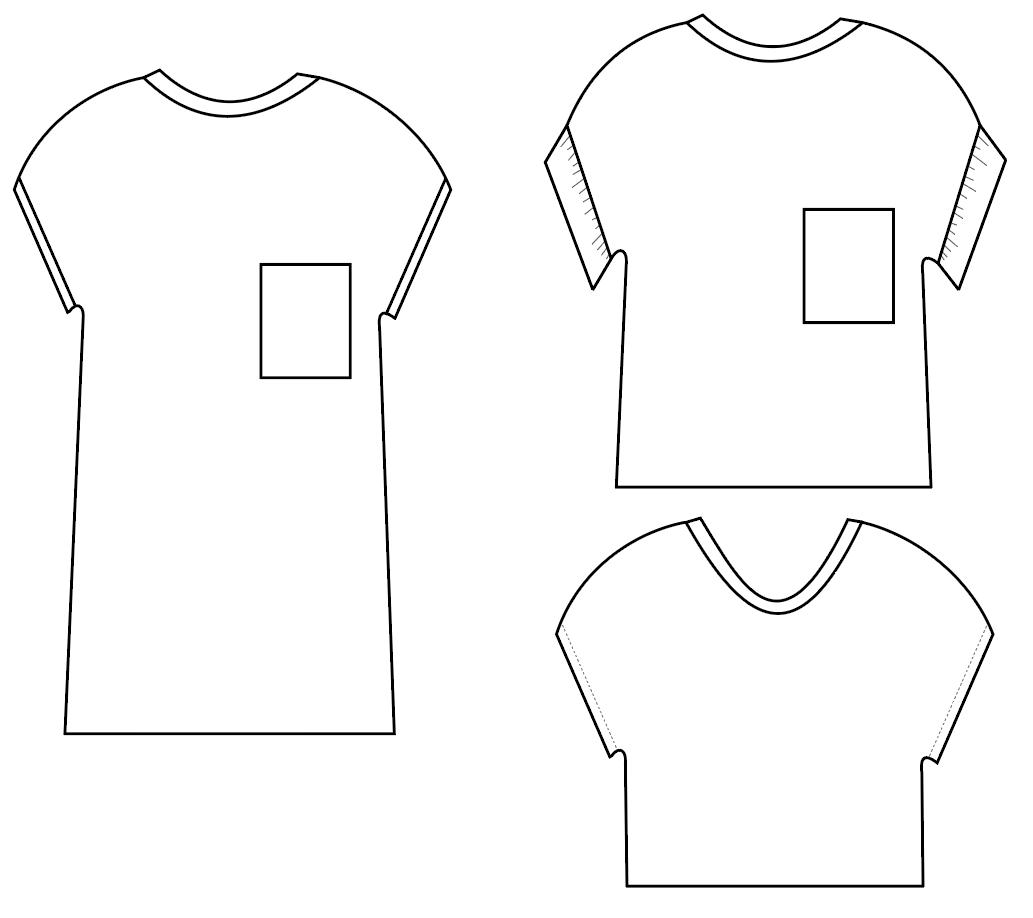 The Sarah top and dress is a short sleeve dolman style t-shirt top / dress. It is loose fitting through the entire garment. The sleeves can be hemmed, finished with a fold over band, or a ruffle. Choose from crop, modest crop, t-shirt, tunic, mini, and knee length. There is also a crew and a scoop neckline. You can also add an optional oversized patch pocket.