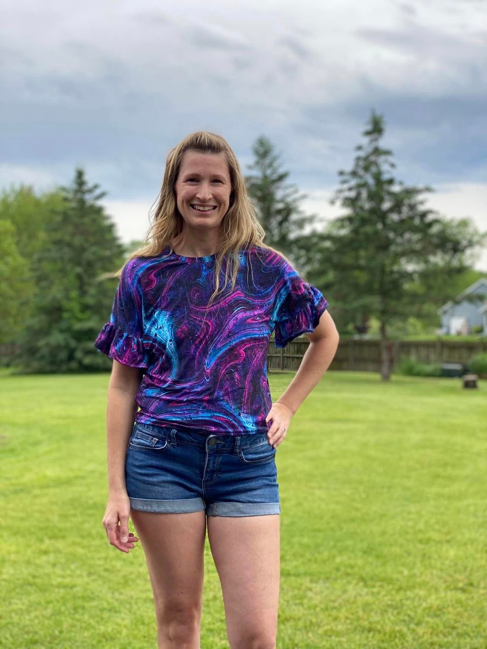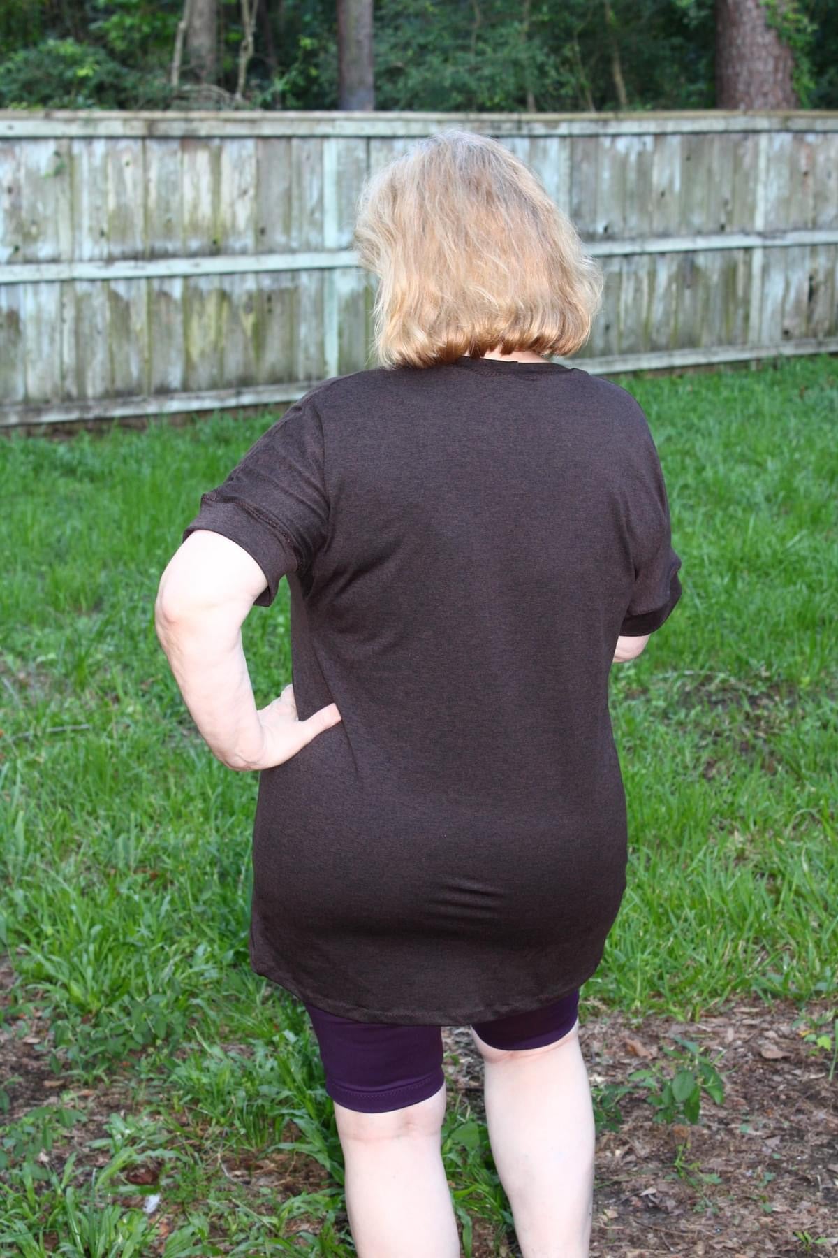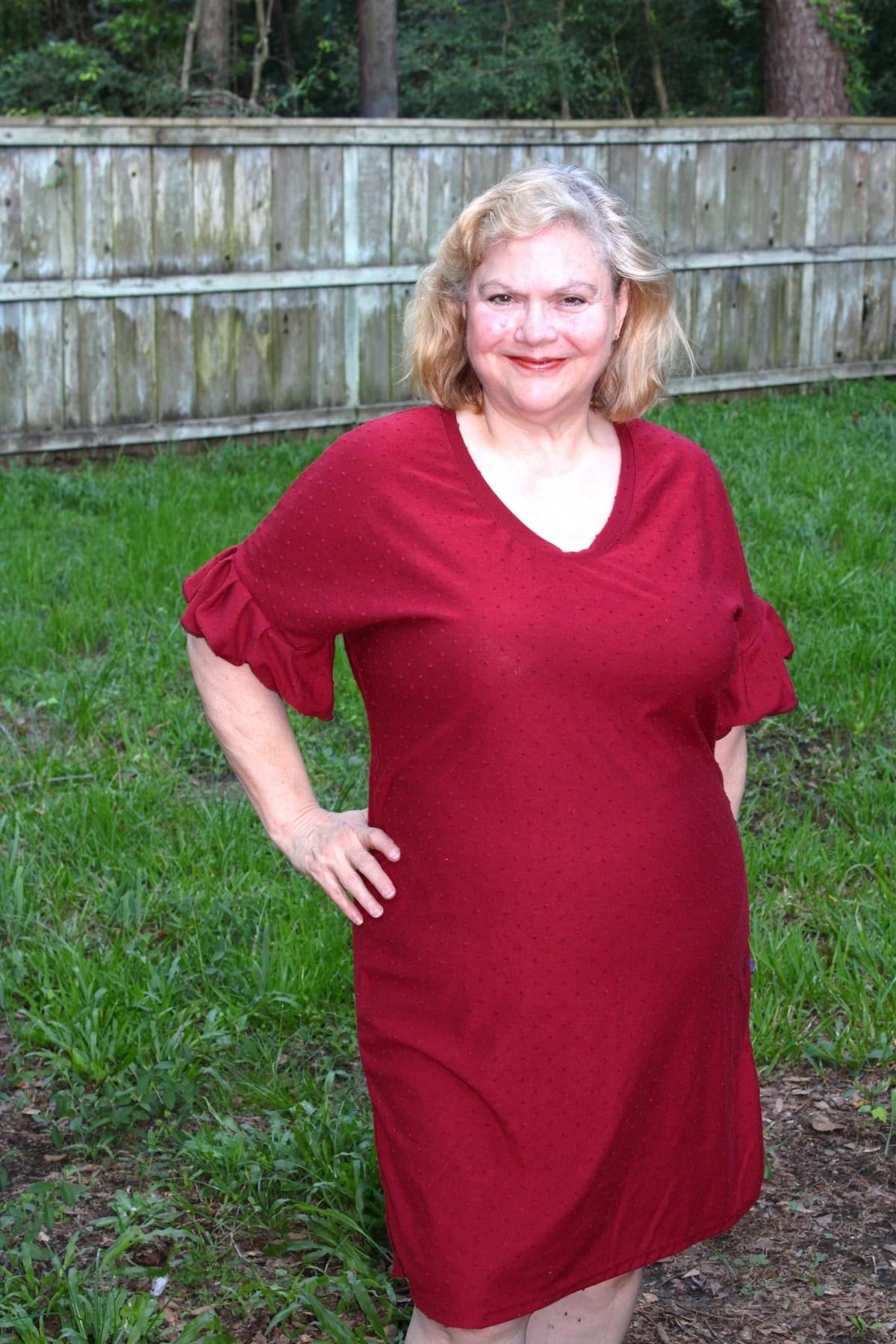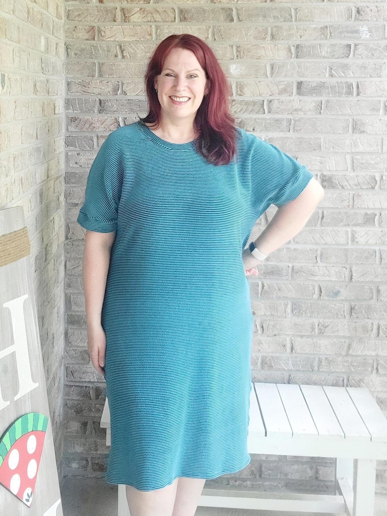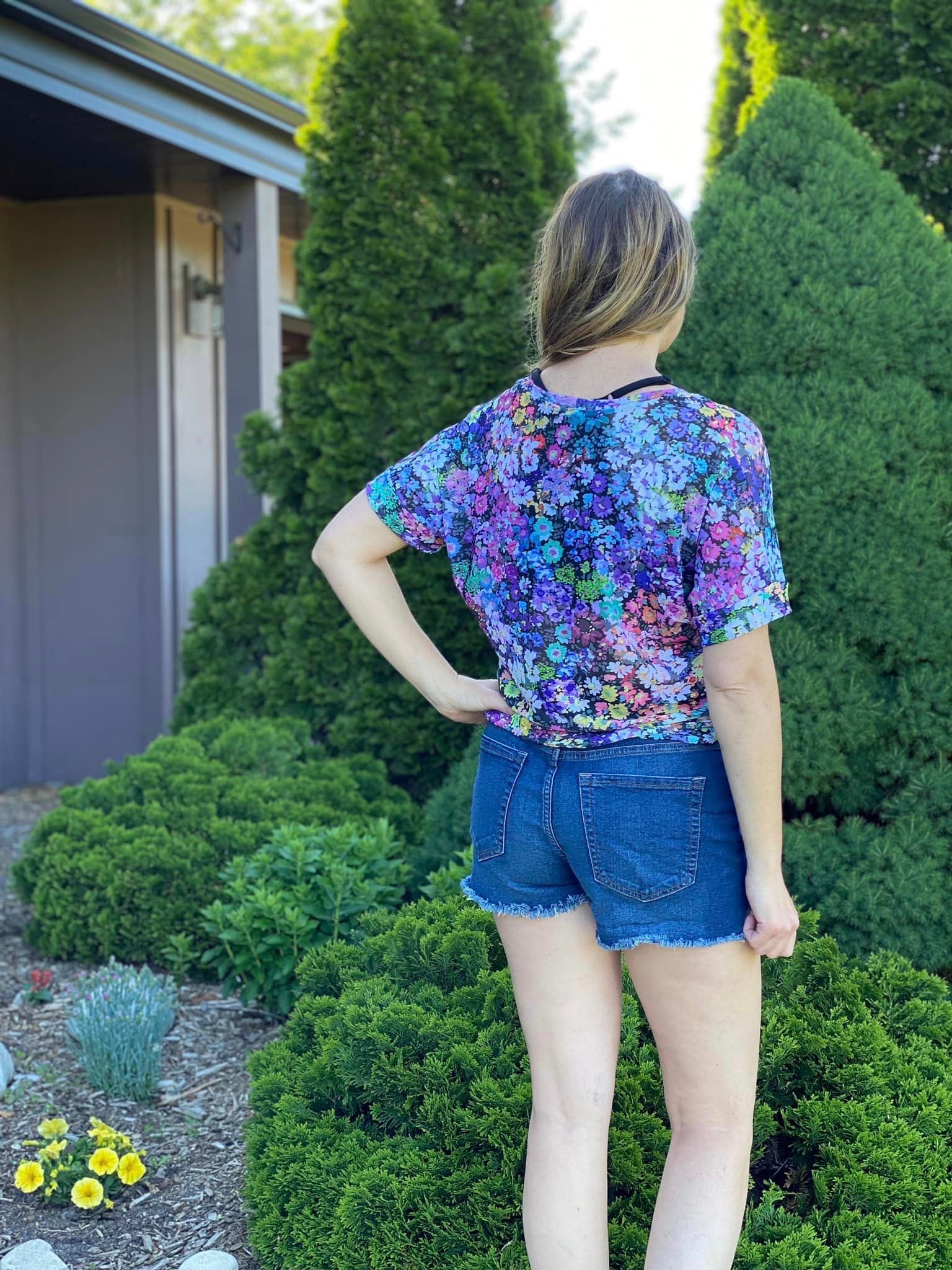 The Sarah top and dress is a short sleeve dolman style t-shirt top / dress. It is loose fitting through the entire garment. The sleeves can be hemmed, finished with a fold over band, or a ruffle. Choose from crop, modest crop, t-shirt, tunic, mini, and knee length. There is also a crew and a scoop neckline. You can also add an optional oversized patch pocket.