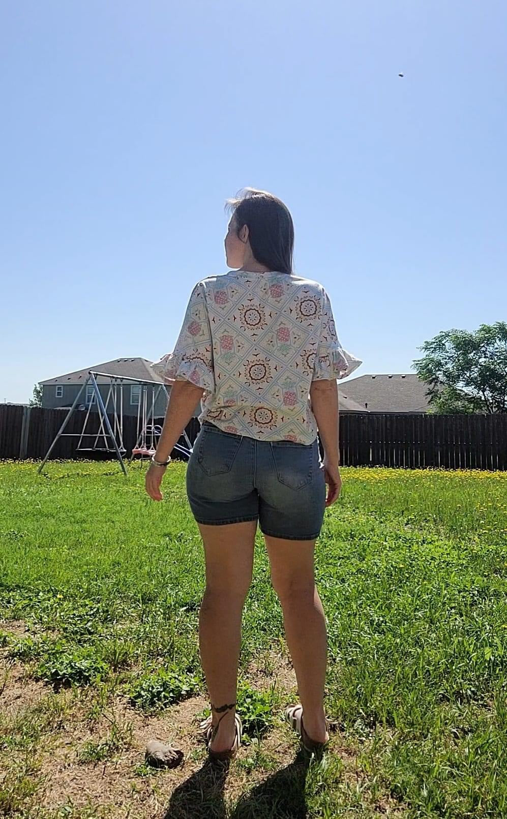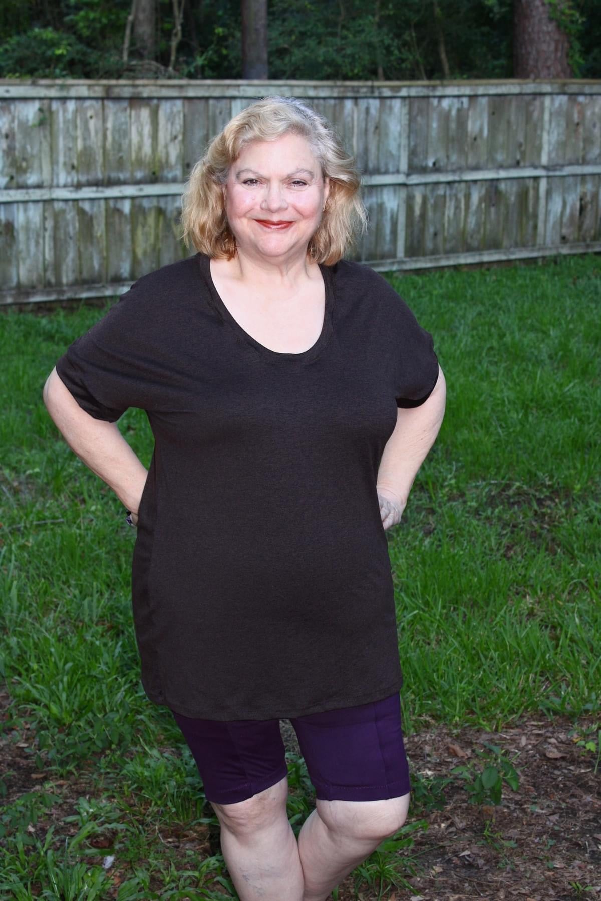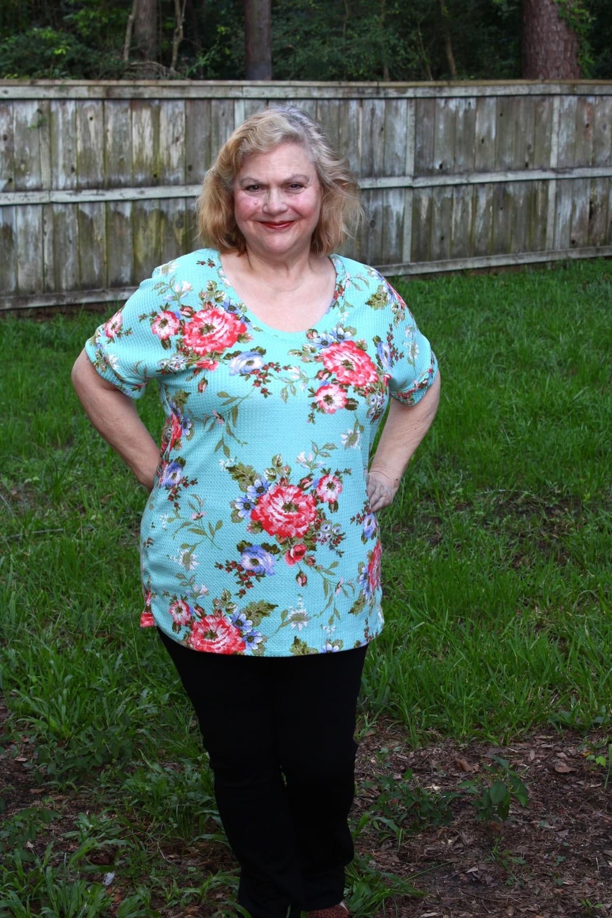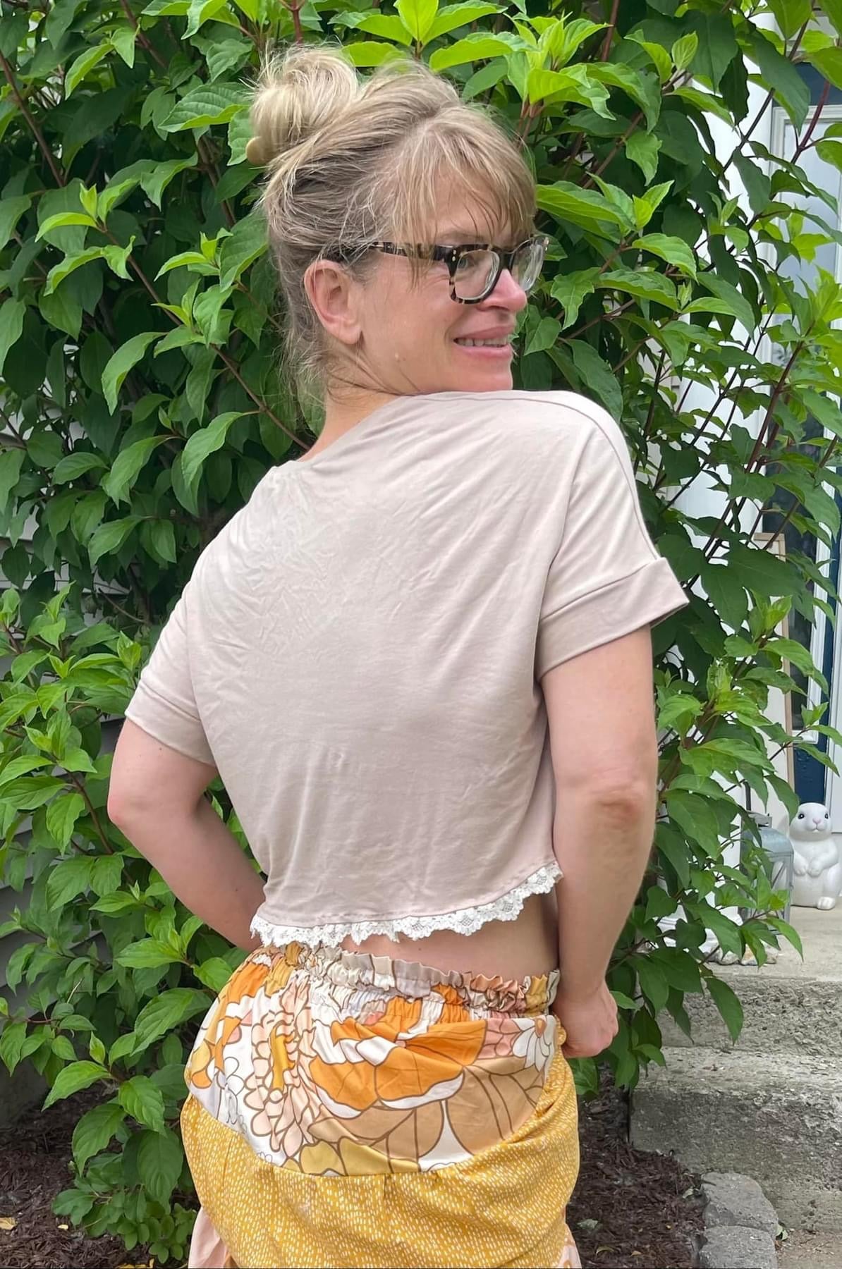 The Sarah top and dress is a short sleeve dolman style t-shirt top / dress. It is loose fitting through the entire garment. The sleeves can be hemmed, finished with a fold over band, or a ruffle. Choose from crop, modest crop, t-shirt, tunic, mini, and knee length. There is also a crew and a scoop neckline. You can also add an optional oversized patch pocket.