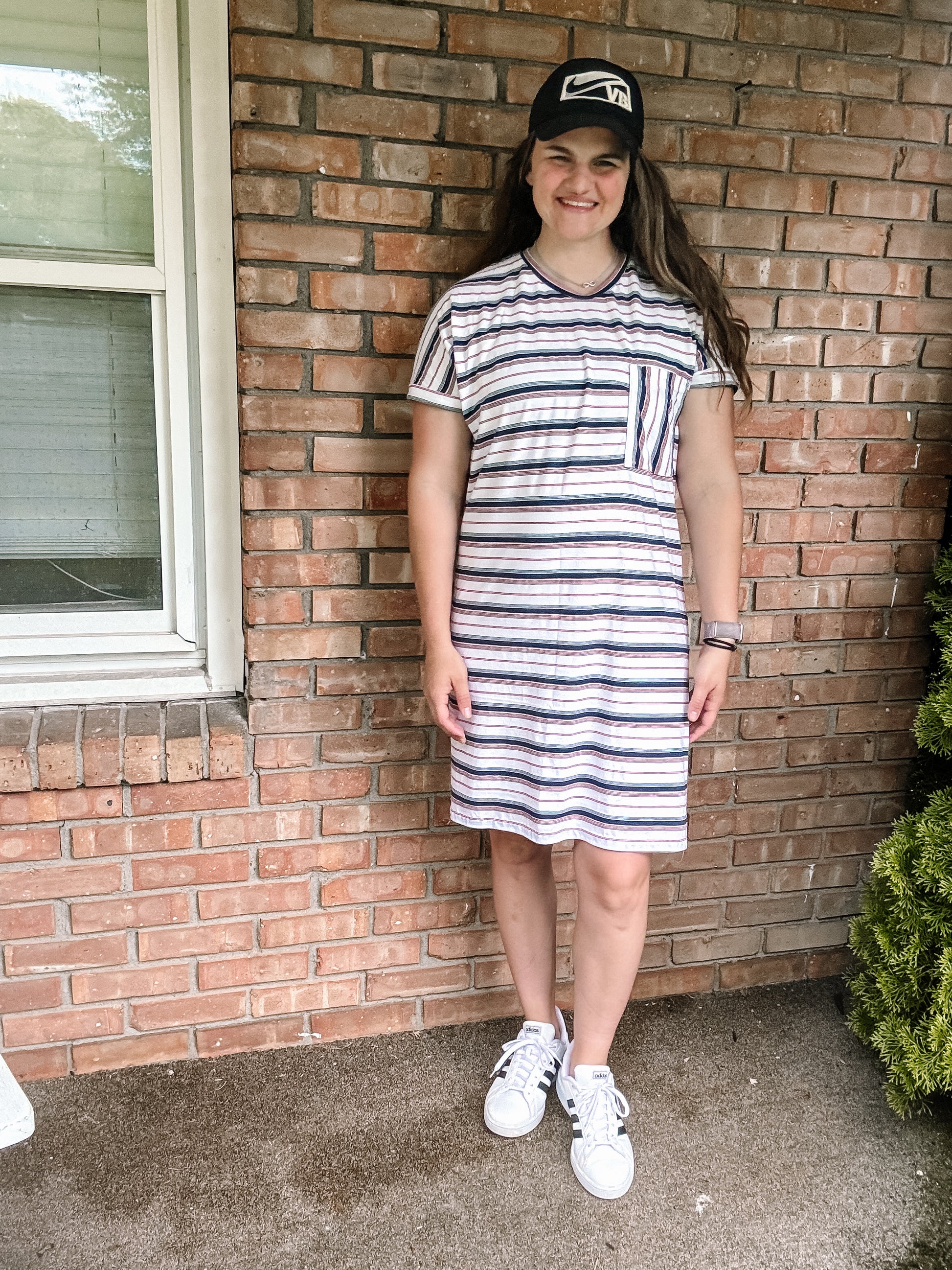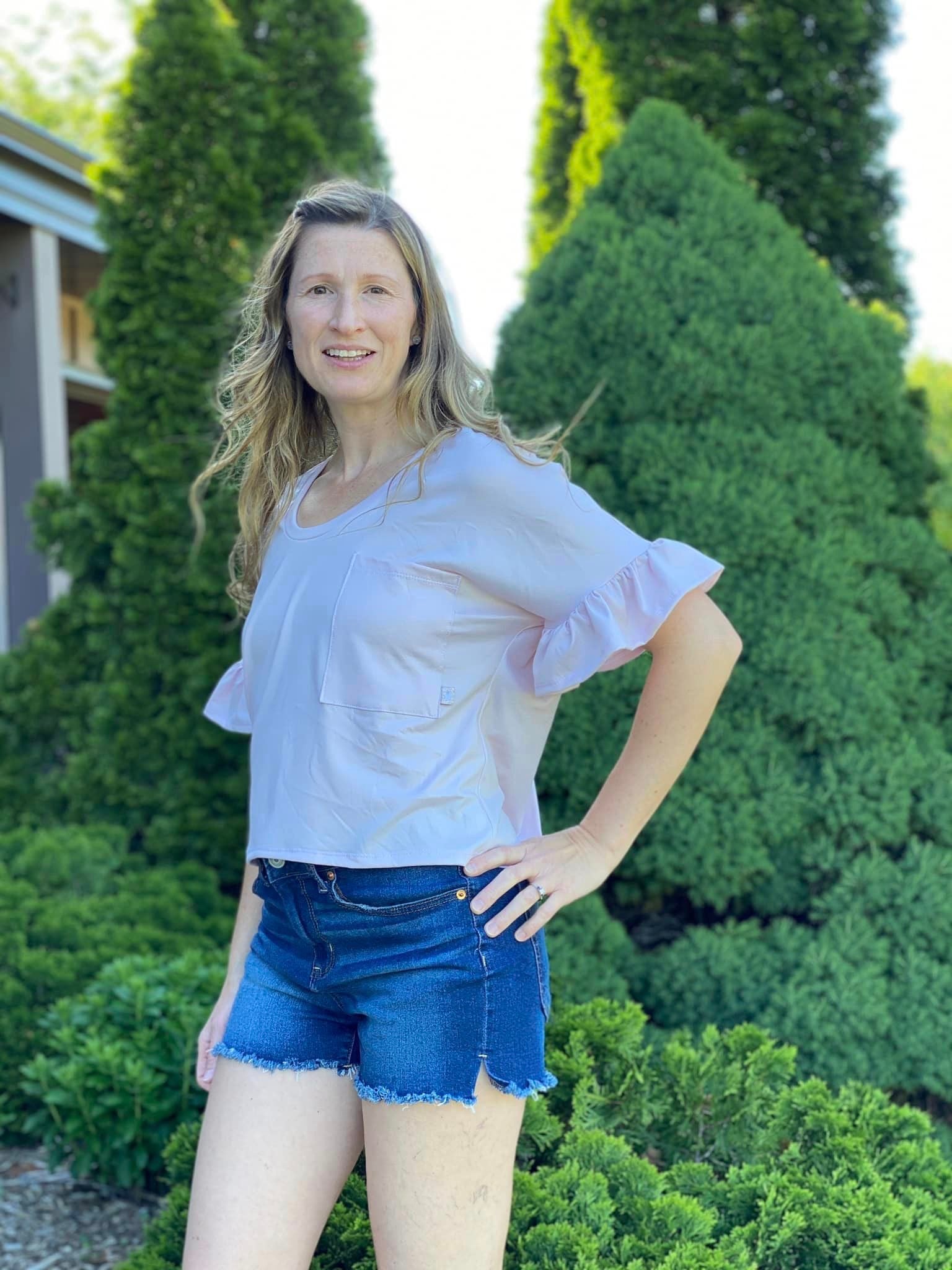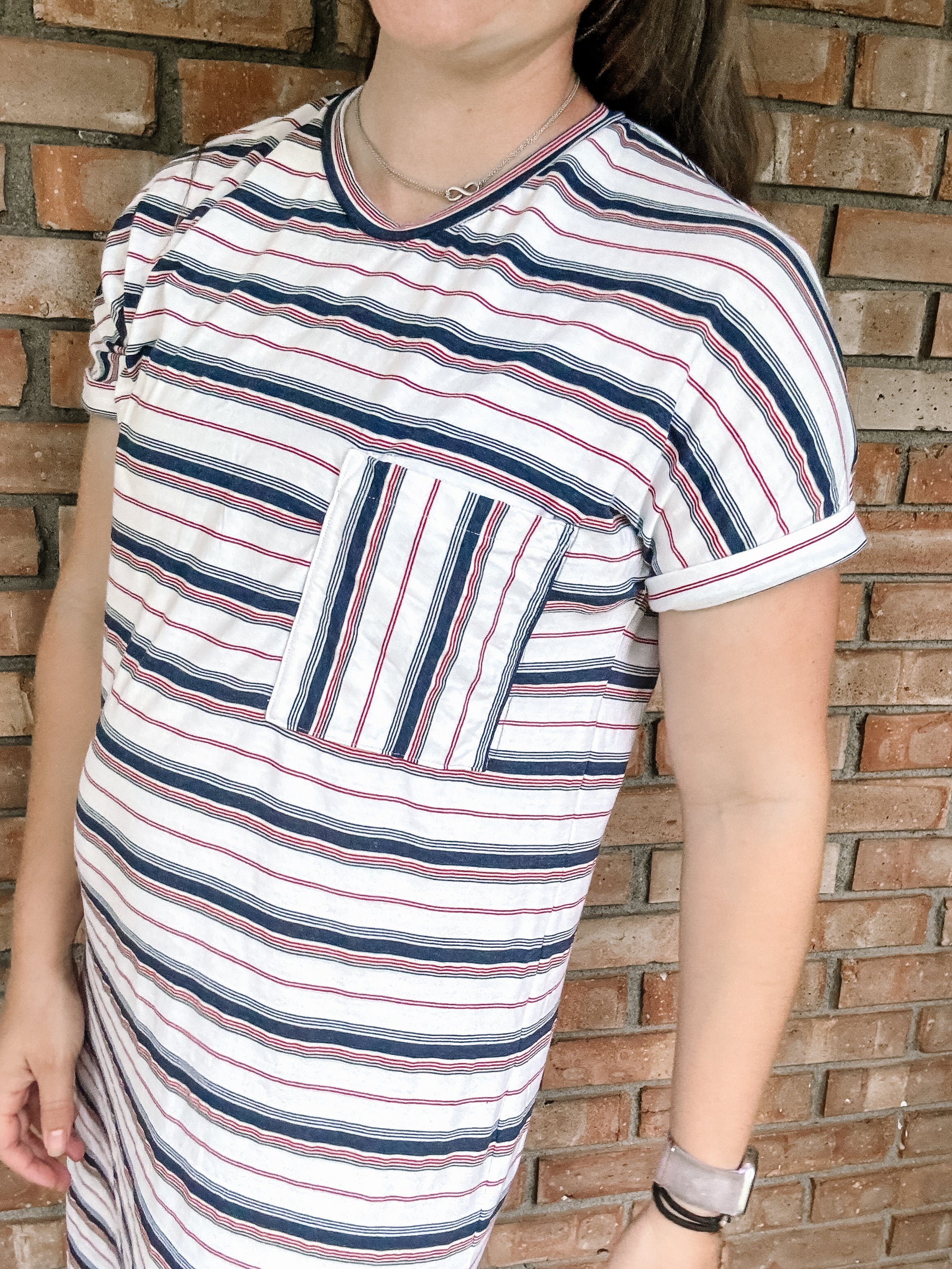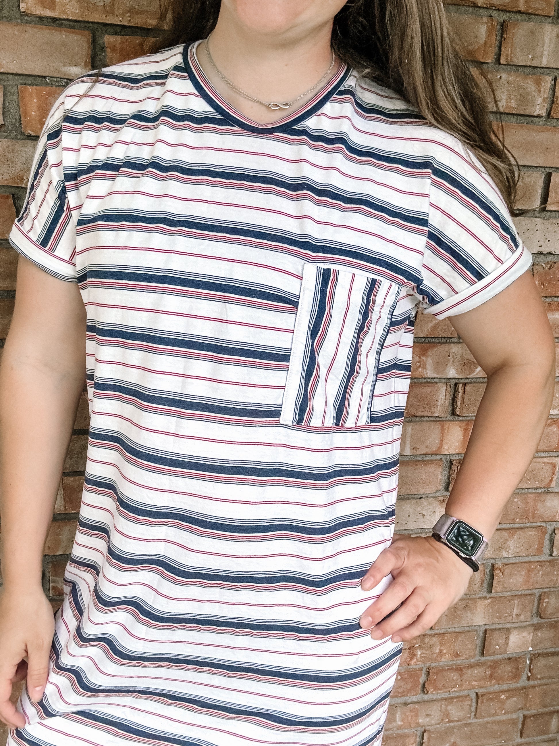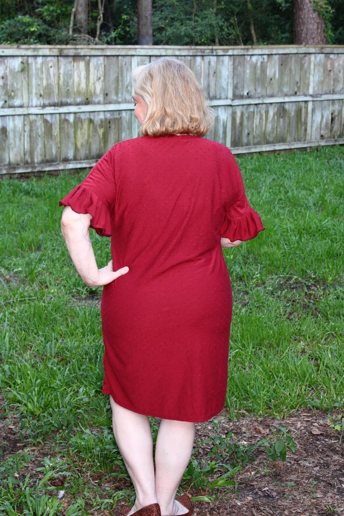 The Sarah top and dress is a short sleeve dolman style t-shirt top / dress. It is loose fitting through the entire garment. The sleeves can be hemmed, finished with a fold over band, or a ruffle. Choose from crop, modest crop, t-shirt, tunic, mini, and knee length. There is also a crew and a scoop neckline. You can also add an optional oversized patch pocket.