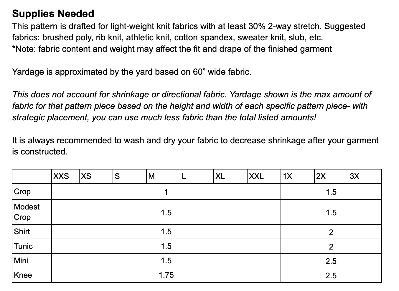 This pattern is drafted for light-weight knit fabrics with at least 30% 2-way stretch. Suggested fabrics: brushed poly, rib knit, athletic knit, cotton spandex, stretch lace, slub, etc.